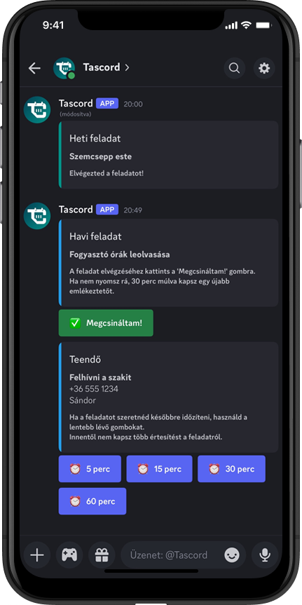 A feladataidról privát üzenetben kapsz értesítést Discordon, ahol azonnal kezelheted is az állapotukat. Az értesítések mellett parancsokkal is irányíthatod a teendőidet.